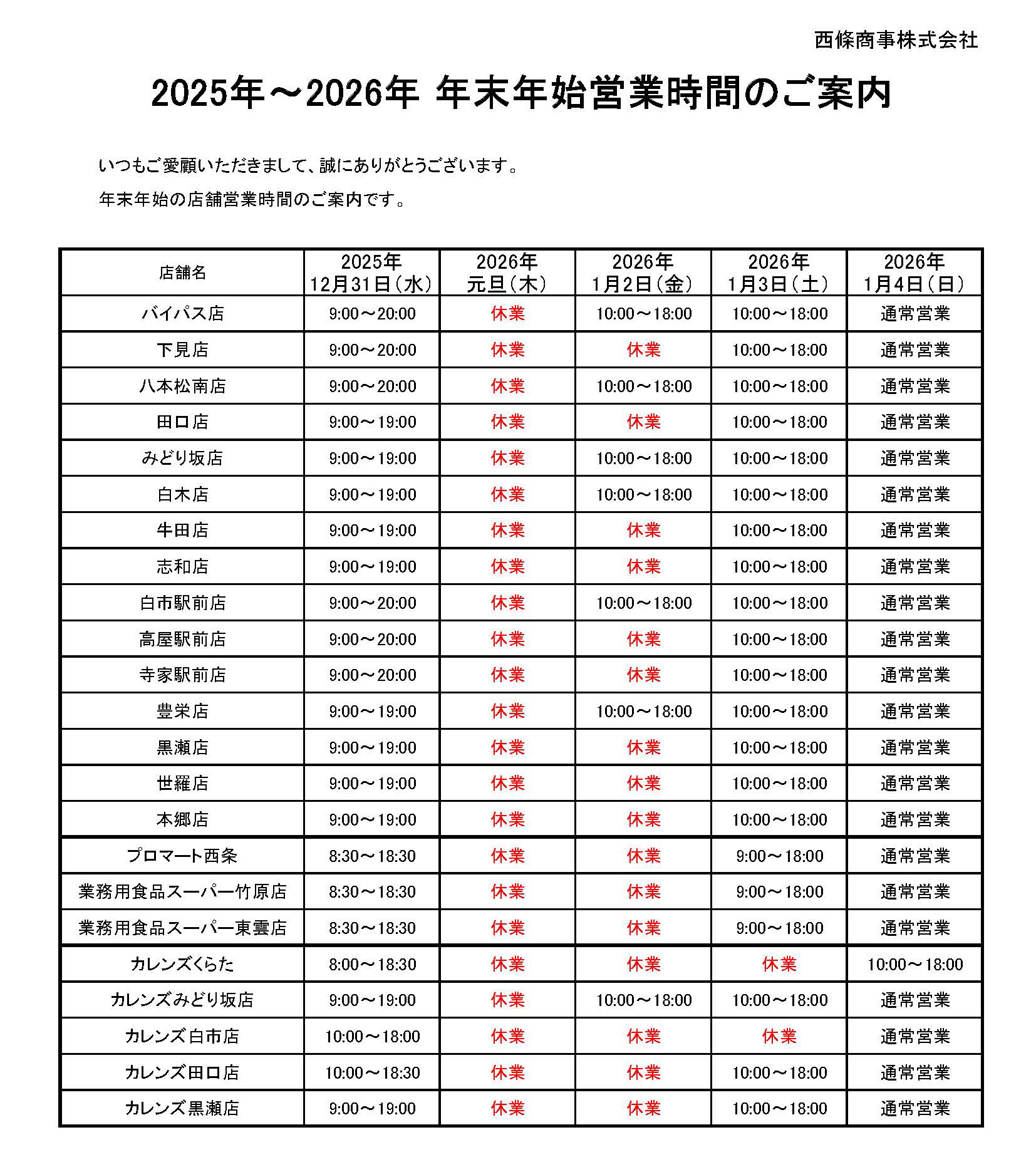 2025年~2026年 年末年始営業時間のご案内