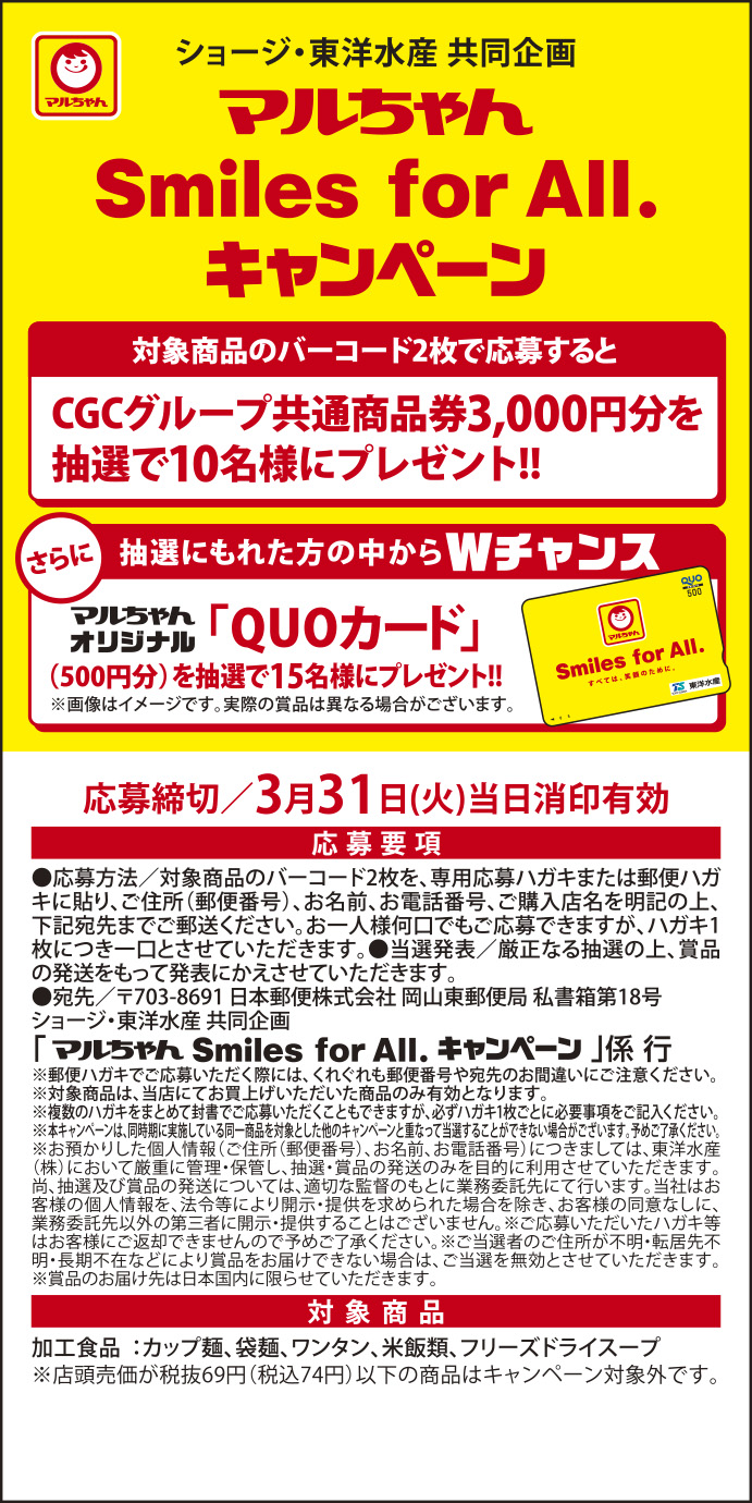 さらに、抽選にもれた方の中からWチャンス、マルちゃんオリジナル「QUOカード」(500円)分を抽選で15名様にプレゼント!!